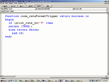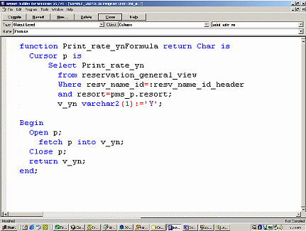 Select the field referencing Rate Code whether this is a merge code or just the field name. Press F11. This will place you in the PL/SQL Editor. Place the following code in between the begin and end commands. Now compile the report and place it in the OPERA Runtimes directory. This will Suppress the rate from the screen when Do not Print is populated. |