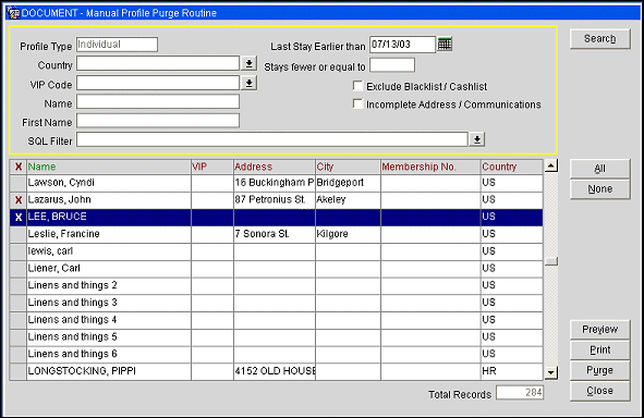Preview. Display the Manual Profile Purge Routine report which lists all the profiles selected to be purged. Available when one or more profile records are selected.