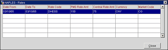View Rate. Select to open the Rates screen. This screen displays the dates of the stay, the rate code, the PMS rate amount, the central rate amount, the central currency and the market code associated with the stay.