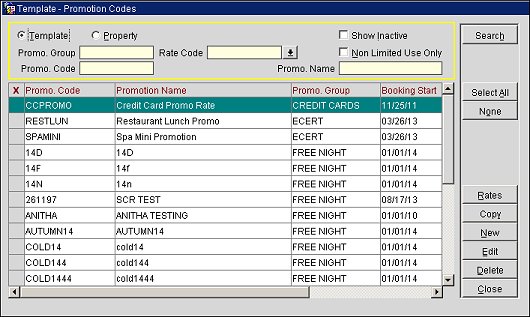 To copy a promotion code and associate it with a property(s), select the Template radio button. The Template - Promotion Codes screen appears.