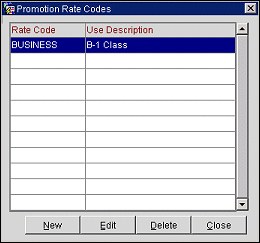 To view, add, and edit the rate codes associated with the promotion code, select the Rate Code button from the Promotion Codes New or Edit screen. (This button is available for reservation promotion codes only.) The Promotion Rate Codes screen appears showing a list of the rate codes already associated with the promotion code.