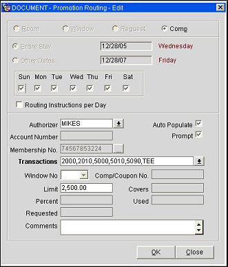 Note: Comp window routing (see Routing Transactions for details) may be applied to a reservation along with promotion code routing provided there is no overlap of transaction codes between the two routing instructions. Promotion code routed charges will be sent to the next available comp window (101 - 108) on the Billing screen; if no new comp window is available (i.e., if 101 through 108 are already defined), the default routing will not populate.