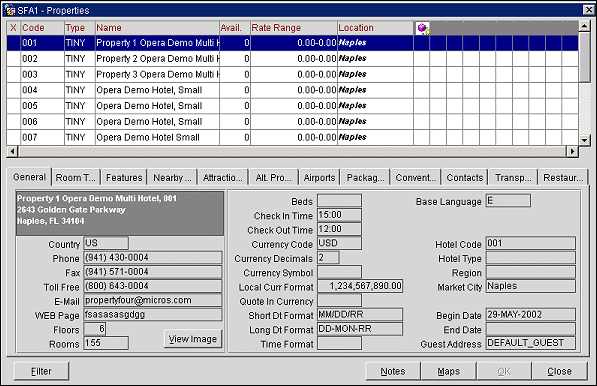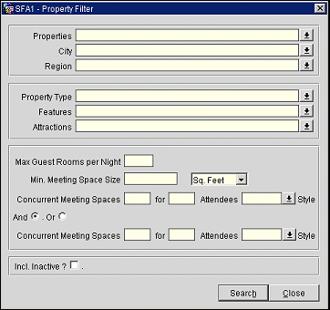 Select Miscellaneous>Properties to open the Property Filter screen. (This screen is available from other locations in Sales & Catering and SFA.)