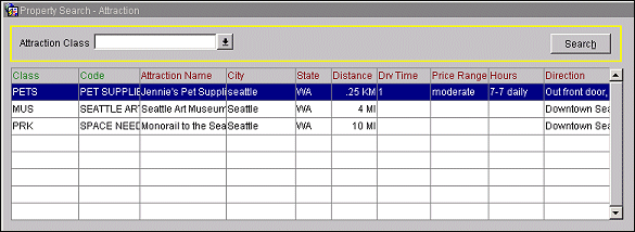 The Property Search - Attraction screen provides a list of the visitor attractions (sights, amusement parks, museums, etc.) in the area of  the property that is currently highlighted on the Properties screen. Attractions are set up in System Configuration>Property>Attractions.