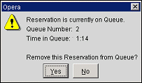 To put the reservation on queue, select No; then choose the Queue button for the reservation from the Reservation Options menu. (The Reservation Options menu is available from the Reservation Search screen, from the Arrivals Search screen, and from the Reservation screen.) A prompt will ask: "Place reservation on queue?" Select Yes.