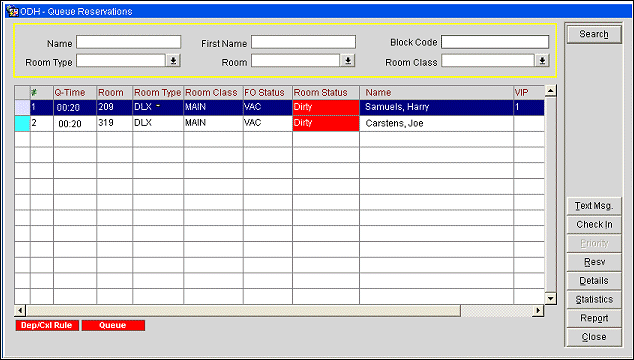 Note: A reservation can be placed into the queue only if the reservation is not checked in and the guest’s arrival date equals the property business date.