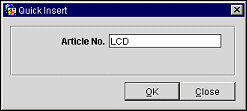 Quick Insert (Business Management>Events>Resources>Quick Insert) allows you to quickly add the exact resource you need to an event without having to filter through multiple search results on the Select Item(s) screen. It is necessary to know the article number for the required item when adding it through quick insert, as it is the only criteria required to add the item to the event resources. The article number is configured on the appropriate item and can be alphanumeric. For example, an LCD projector may be configured at LCD1234 or simply LCD.