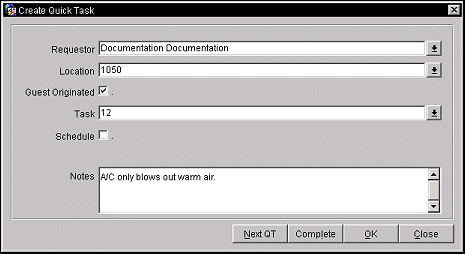 Notes. Enter any additional notes by typing free-form text that further describes details of the task. The next Quick Task saves the current Quick Task and allows entry of another task. The location and requestor field default to the same value as the previously entered task.
