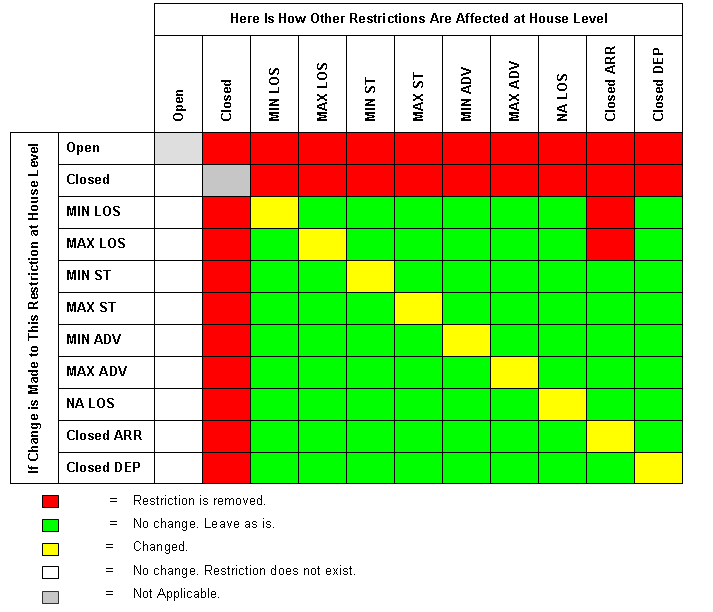 The following table provides a detailed look at how changes to a restriction for a given date(s) at one level (in this example, at the House level) affect other restrictions at the same level.