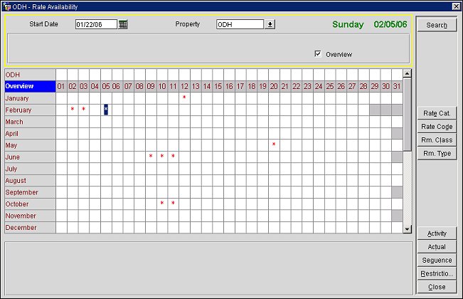 Overview. Select this check box to view rate availability by month and day for a 12-month period, starting with the month in the Start Date field. (You may scroll down beyond the current 12-month period to see availability for any month and date in the future.)  The Overview shows dates having any kind of restriction indicated by an asterisk. (When you select this option, the Rate Category/Rate Code, Room Class/Room Type, and Year View search criteria are unavailable.)