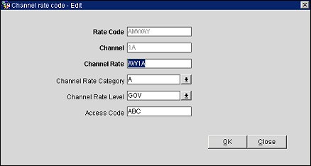 Edit. (right-side) When a channel/channel rate code is highlighted on the right-side, and the Edit button appears, you can select the Edit button to modify the channel rate mapped to the selected rate code on the left-side. The Channel Rate Code - Edit screen opens.
