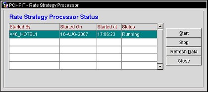 The Rate Strategy Processor is a utility that when activated, no new restrictions are created, but only the implementation of existing set strategies are used for evaluation. Available when the Rates>Rate Restriction application function is set to Y, from the Utilities>Processors>Rate Strategy Processor menu option. The processor can be started, stopped and data relating to the processor (i.e. restrictions) can be refreshed.