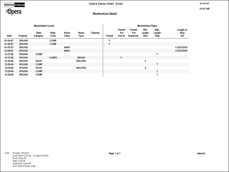 The report can also be run for up to 90 days prior to the current business date, to display the restrictions that were in place on a given date. When the OPR<version number>ORS license code is active, and channel restrictions have been set up, the channel restrictions can also be viewed on this report.