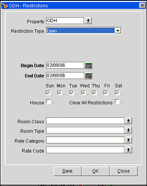 Note: When you set a rate restriction (e.g., room type DLX is Closed for Arrival from 08-23-03 to 09- 23-03), it remains in effect for the period determined by the Begin Date and End Date. You may however, cancel or "reverse" the restriction by setting the opposite restriction type. (For example, room type DLX is Open for Arrival from 08-23-03 to 09-23-03.)