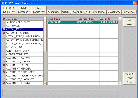 Rebuild Indexes is a menu option located in Utilities>Tools>Rebuild Indexes. All the tables with the respective index will be marked after step 20 is completed. To start the rebuild, simply click on the rebuild button. Please note that a password is needed to start the index rebuild. The password is provided to clients as needed by Oracle (currently controlled by development).