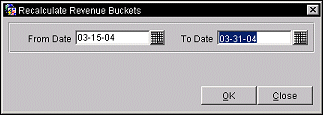 Date ranges that are entered must not exceed a three month period. When the date range is entered, select the OK button to recalculate the revenue buckets.