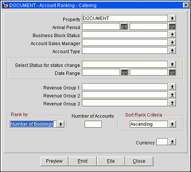 This report allows the printing of accounts ranked by a selection of criteria. The data that is being considered for the ranking comes solely from the group bookings associated with the appropriate accounts, not any individual production which might be linked.