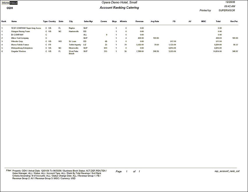 The report is a line report that will print the following data: Account rank and account name. Account type, country, state and city. Account owner, generated covers, number of bookings, number of room nights, room revenue, F&B revenue, other revenue divided by revenue groups as defined in the filters (up to three), total revenue and revenue per occupied room. Revenue per occupied room is an average amount per room-nights based on produced room revenue and catering revenue. The report can be ranked and printed in ascending or descending order.