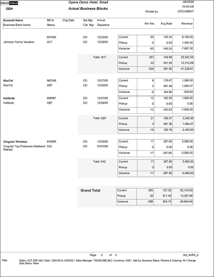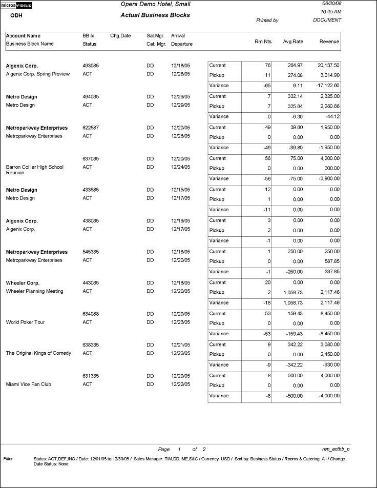 This report compares booked group rooms and revenue and average rate, and picked-up group rooms revenue and average rate, and prints the variance between those values.