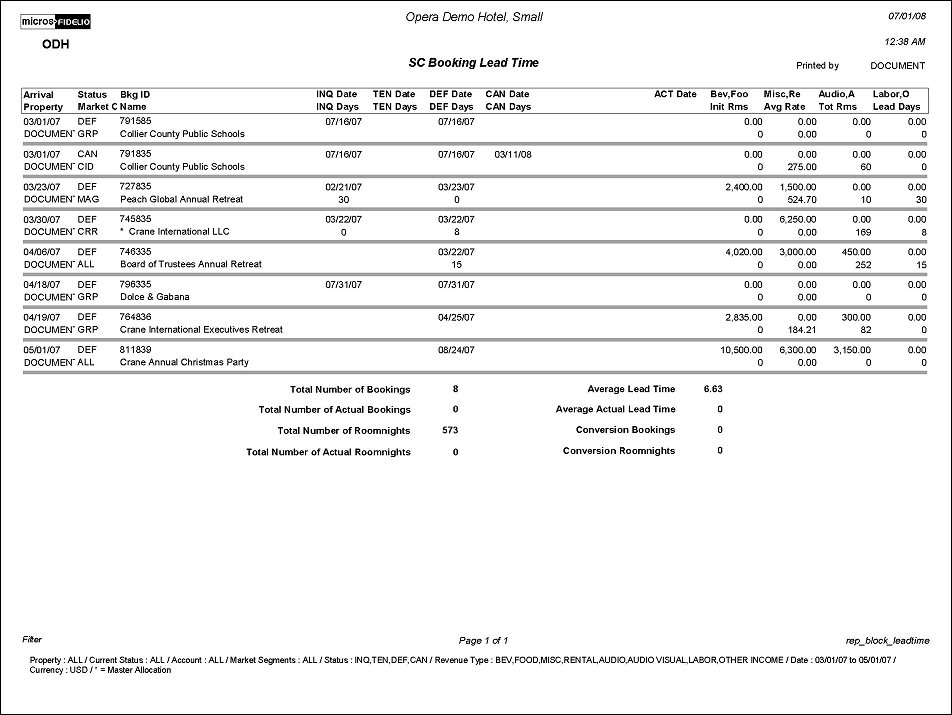 The far right side of the report displays the date that the booking was placed in actual status; this is a default of this report and cannot be user defined. Each record can reflect up to four revenue types and their associated totals. Each record will also contain, by default: the initial rooms count, average room rate (which is calculated inclusive of packages and taxes) total room count, and the number of lead days per booking.