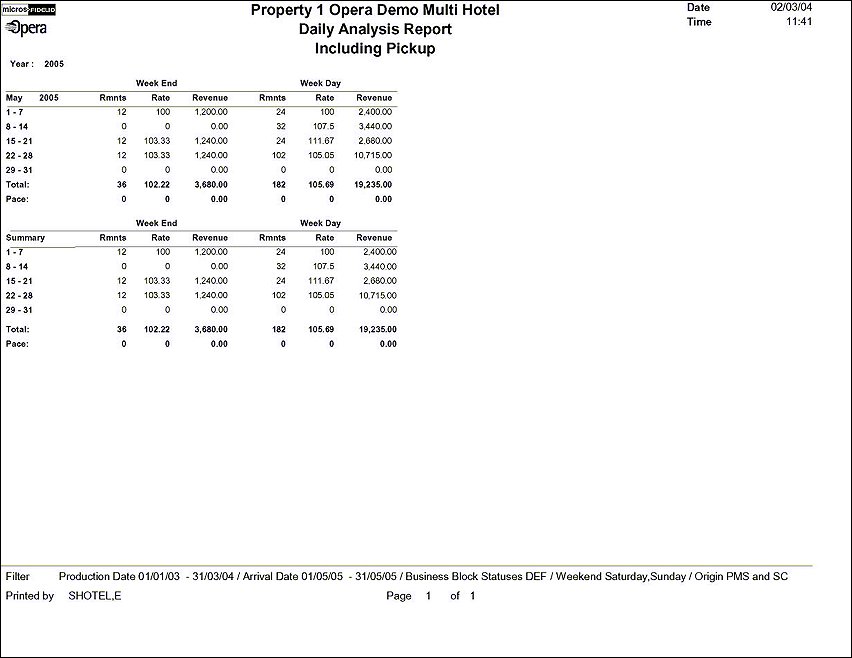 The report body prints in sections for each selected stay date period. Within each stay date period one row per configured group is printed. The produced number of room nights, revenue and average rate is calculated. Separate figures are calculated within each group for the weekend and the weekday stay dates. After printing all section for the selected stay- date period, one summary section, also divided into the same day groups will print at the end of the report