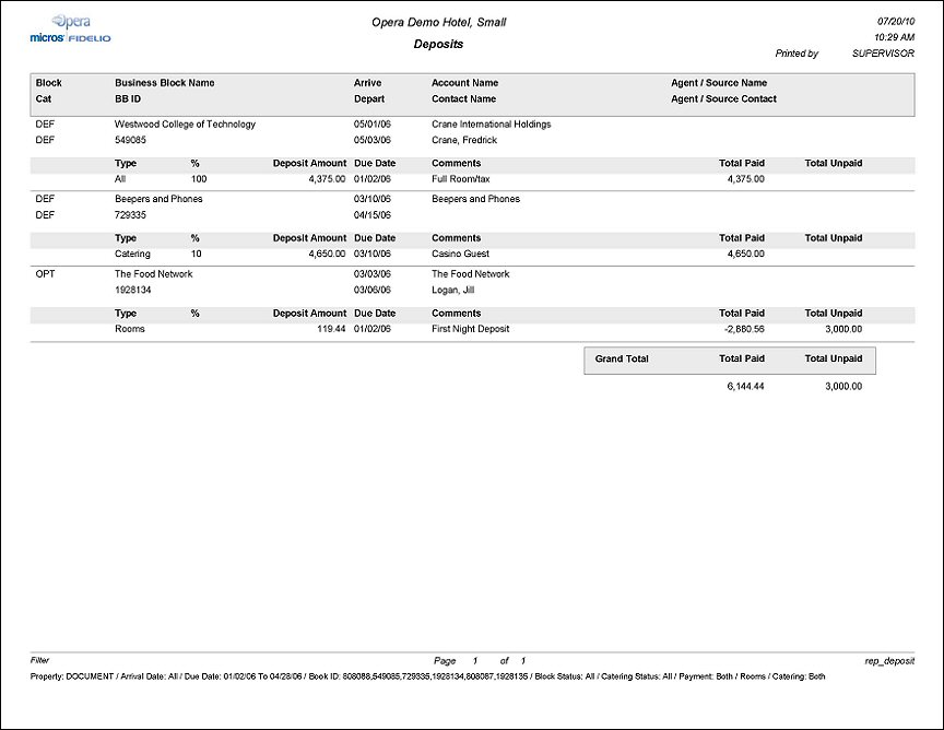 The report will print a separate section for each business block, in booking id order. The business block details printed include rooms status, catering status, business block name, booking id, arrival date, departure date, company account name, company contact name, agent or source account name and agent or source contact name. The deposit data contains the deposit type, percentage of the total that the deposit represents (if it has been entered that way), deposit requested amount, due date of the deposit, deposit comments, total amount paid and the total amount unpaid for each specific request.