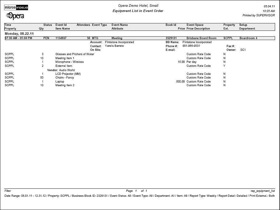 If DETAILED has been selected on the report order form, additional information about account name, contact name, contact on site, block name, and catering owner code, as well as contact communication details are printed for each event also.
