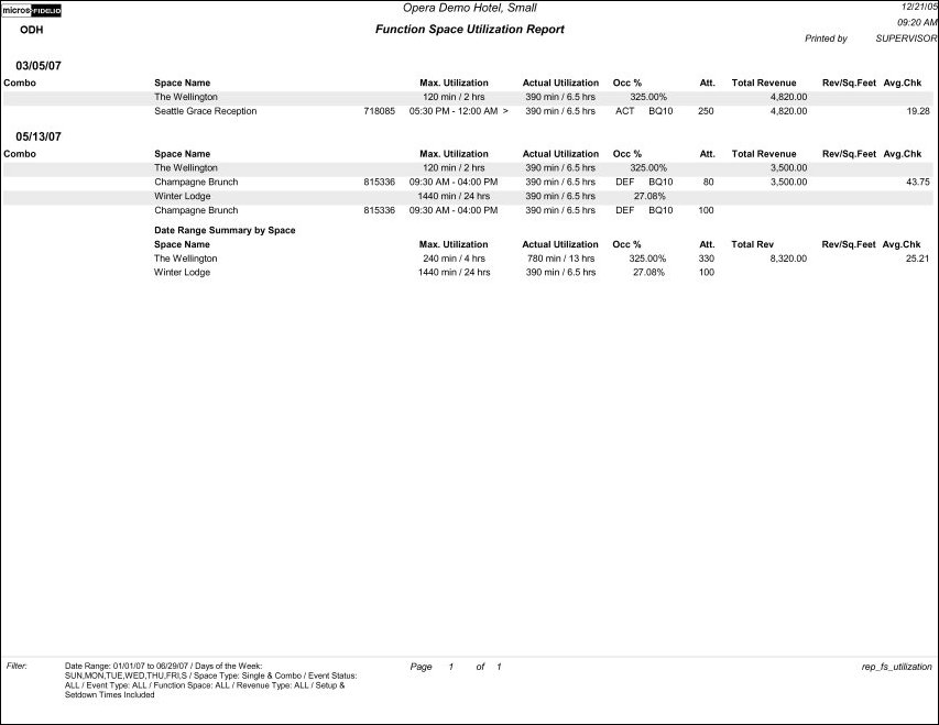 This report is ordered by row, one row per space/day. Each row contains the following columns: Date, Room Type, Space Name/Event Name, Business Block ID and Event Scheduled Time (displays only when the Print Events option is selected), Maximum Configured Utilization, Actual Utilization, Occupancy Percentage, Number of Attendees, Total Revenues and Revenue per Square Footage of Function Space, or Square Meters if the application setting Catering>Measurements is set to Metric.