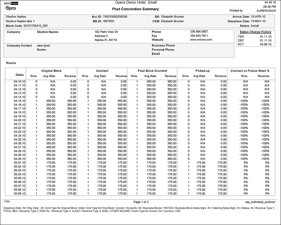 Picked-up room nights, average rate and revenue. This information is taken from the picked–up reservations of the block in an integrated S&C and PMS OPERA system. The revenue and average rate shown are NET of any inclusive taxes or packages in this area. Please note that in an S&C stand-alone environment the pick-up grid will print as it has been entered into the pickup grid page on the block grid (right click on the block grid header). In this case the revenue and average rate are as entered on the booking without calculating out inclusive taxes and packages if any exists.