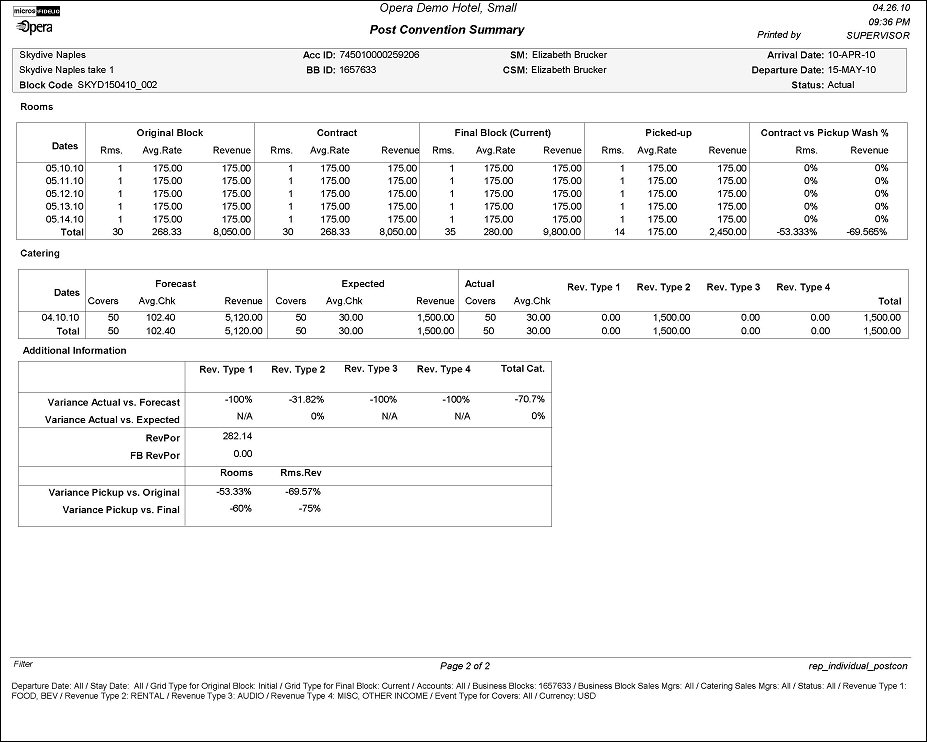 The Post Convention report only displays when the OPS <version number> Sales & Catering license code is active. This report is an ideal recap after any group or catering booking as it compares room nights and revenue as well as catering revenue as it was originally booked versus the actual materialization of the booking. For room nights and room revenue multiple figures can be printed, utilizing the block grid snapshot functionality.