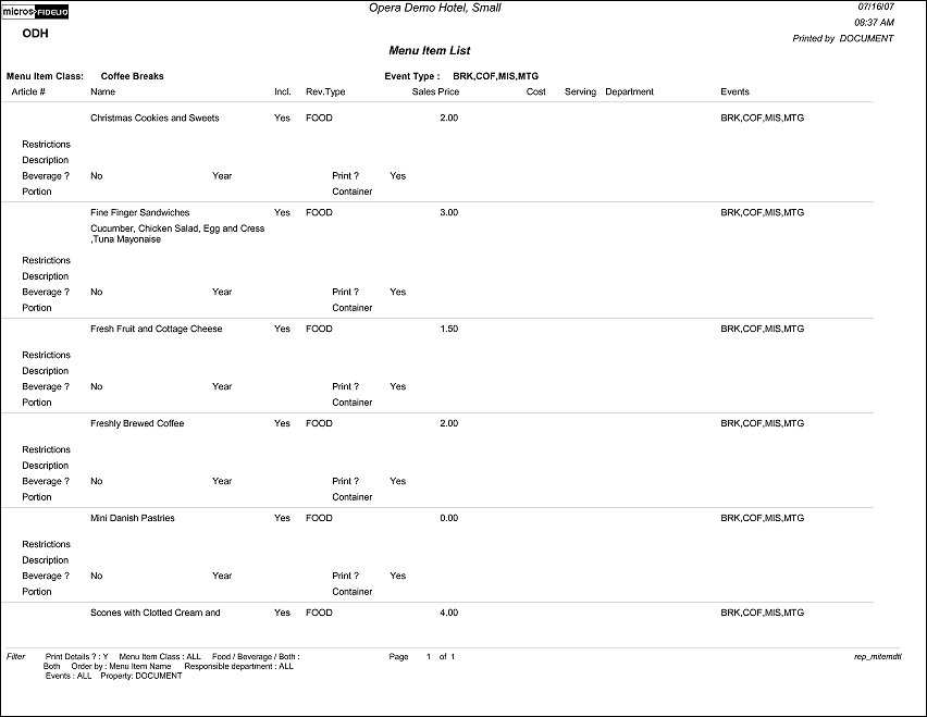 This report is helpful in reviewing the configured menu items with their internal criteria. It is typically printed during and after configuration of menu items to verify that all relevant data has been entered. The same would be applicable when menus and menu items are changed. Obviously the report can be printed at any time though to review the current catering menu item configuration on paper.