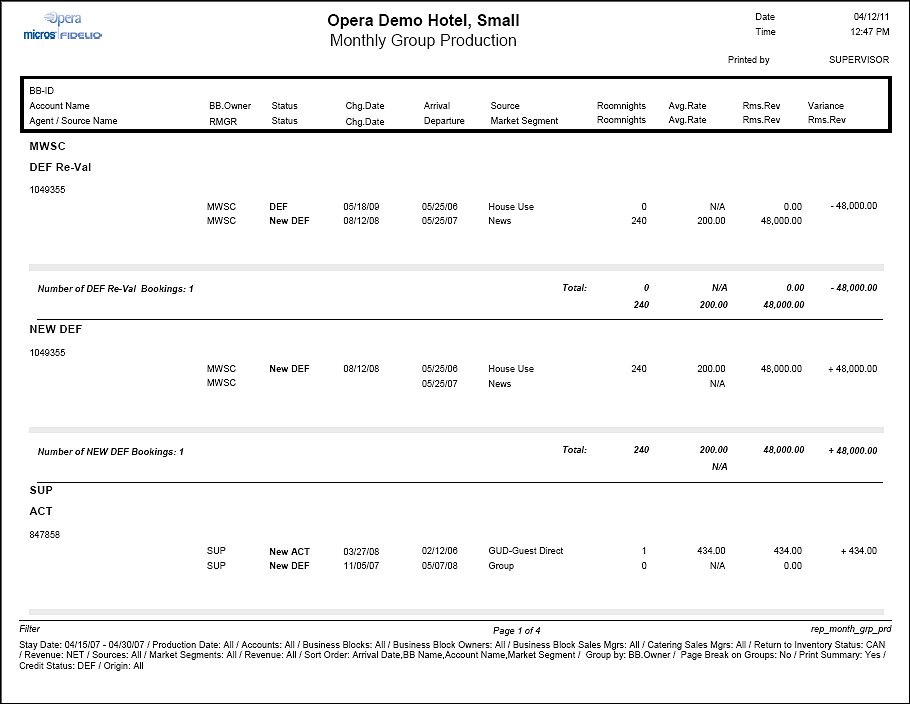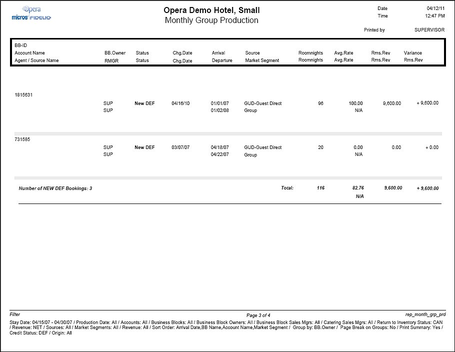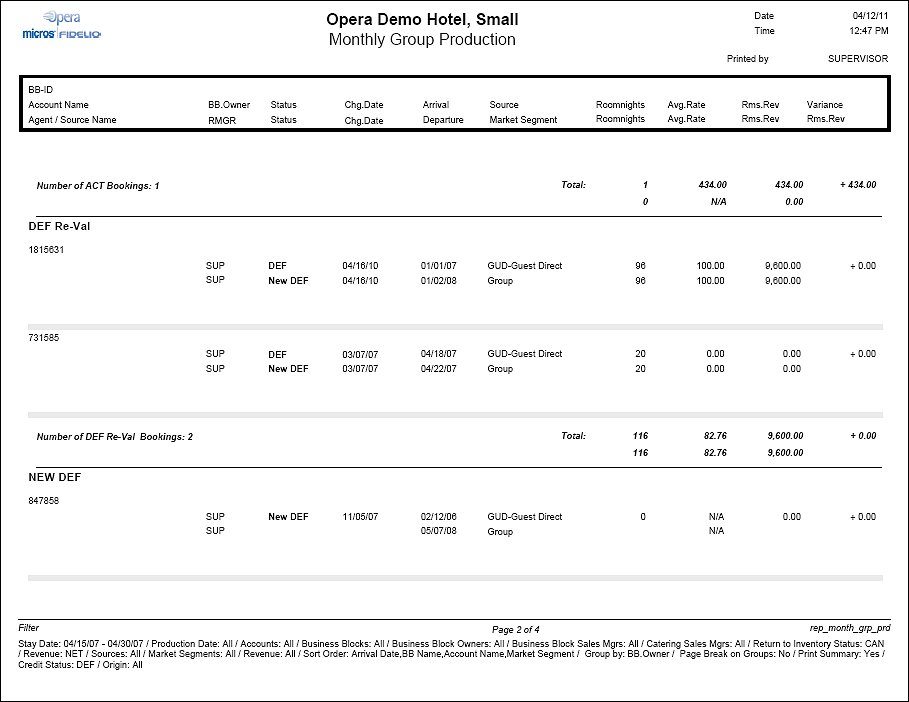 The upper row shows the total number of room nights, total average rate and total revenue of the booking at the end of the production period including the changes that have been made to this booking in the production period. The second row represents the status the booking was on at the beginning of the production period. The difference in room revenue from beginning of the production period to the end of the production period will print as the last column per booking.