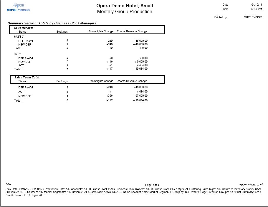 The report will print a summary page for all sales managers if the appropriate flag has been checked on the filter form. It will show the total amount of CHANGES in room nights, revenue and average rate within the production period by sales manager. The changes are shown in separate rows per status for the selected main group. Cancellation details will not display on this report.