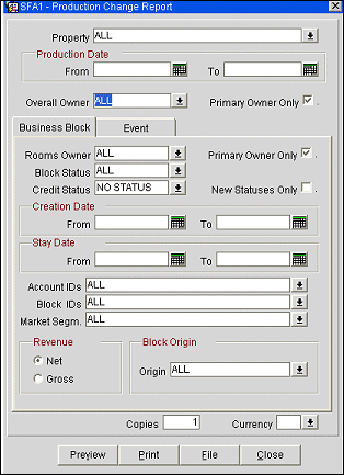 Production Date. Defines the date range for which booking changes should be recorded. Each change that is done to a booking status, or booking room nights and revenue, is recorded in a specific production change log. The Production Date Range filter will scan the entries in this production change log to search for any booking changes that fall under the other criteria that have been selected on the filter form. By the nature of this date range filter, only dates in the past are valid entries, because there cannot be any entries in the booking change log after the current business date. To illustrate the above: A booking that gets created on status TEN in April 2006 with Stay Dates in October 2006 can turn to status DEF in June 2006. In the above scenario there would be two entries in the change log for this booking, one for the creation of the booking on status TEN in production period April 2006 and one for the status change to DEF in June 2006.