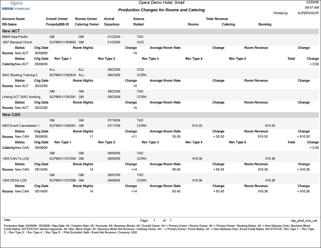 The Production Changes for Rooms and Catering report combines Rooms and Catering Production. It calculates the room nights, average rate, room revenue and catering revenue of all bookings that have been created on specified statuses, which had their status changed to a specified status or which were on the specified status before the production period, but had changes done to their number of room nights or revenue in the production period. The figures are calculated and displayed on a booking-by-booking basis and for catering on a status-by-status basis within each booking.