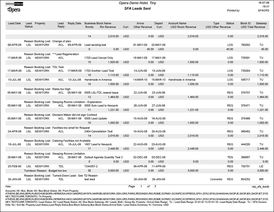 In a second line per lead, room nights, room revenue, booked currency, other revenue, booked currency, converted room revenue in requested currency, requested currency, converted other revenue in requested currency, requested currency, and total revenue in requested currency will print. Revenue and rooms are current at the time of printing (not production figures).