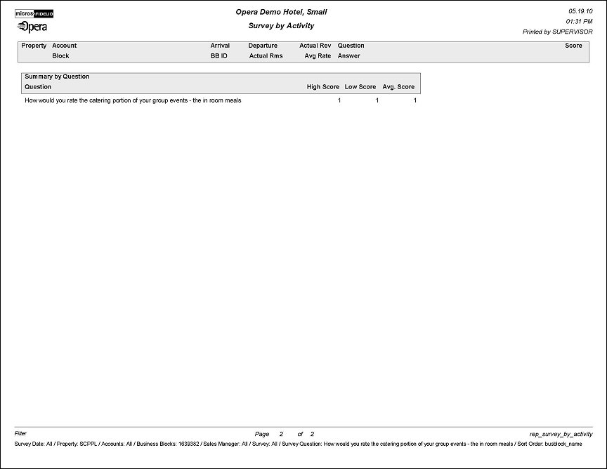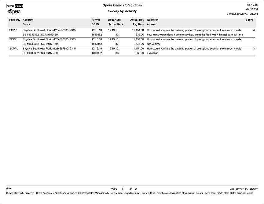 This report prints the survey results that are linked to activities. To get a total picture of how services that the hotel provided were perceived by the client, the report can be filtered by business block or account. Alternatively, it is possible to filter on a specific question for a date range regardless of the business block or account. This would paint a more concise picture of how certain areas of service (i.e., quality of Food & Beverage) were perceived by a multitude of clients during the specific time frame.