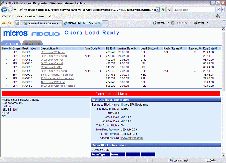 Room Block Information. Detailed room grid for the business block if this has been created on the SFA system. If no room grid is attached to the booking, this section will not appear. Note the ability to update the rates directly from the Web Lead Reply screen in the Room Block Information section. If any changes are made to the rates from here, they are updated and sent back to SFA.
