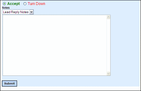 Accept/Turn Down. Select the radio button that reflects the desired response. If Turn Down is selected, a list of values will pop up asking for a turn down reason. See SFA Leads Configuration.
