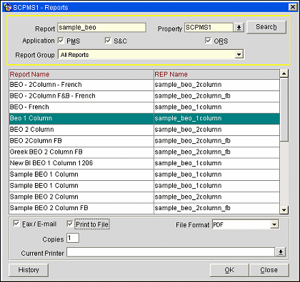 To choose from OPERA’s standard reports, select Miscellaneous>Reports from the OPERA main menu. The Reports screen appears. (The Reports screen also appears wen you select the Print button from the Profile screen Options menu for company. travel agent, source, and contact type profiles.)
