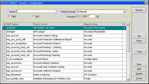 Copy. (Available when the OPP_MHOT Multi Property PMS Add-on license is active.) Copy the reports marked with an X in the X column to another property or properties. (Use the All or None buttons to select/unselect all reports.)