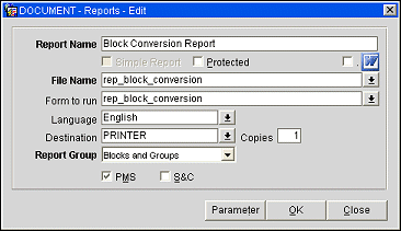 A report consists of two parts, the report parameters and the report definition. The parameters determine the report’s form to be used and the Sort or Group By criteria, of the setup. The report definition creates a separate file for each report, with an .RDF extension. A single report definition may be associated with several different report parameter settings in order to produce different information on the same report. For example, a guest list showing names, arrival and departure dates, and room numbers may have one set of parameters to show arrivals only and another set of parameters to show both arrivals and in-house guests.