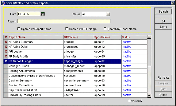 Print. Print the reports selected with an X. The reports will print to the default End of Day Sequence printer. You cannot print or preview a report that is Inactive. It must be Recreated first.