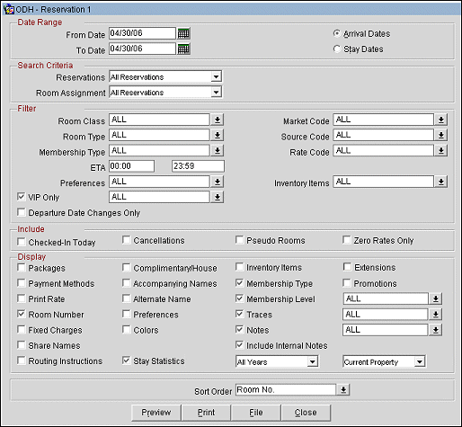 When selecting to print by Arrival Dates, the Checked-in Today check box displays. Output will include those guests checked in today (Business date) including Day Use reservations as well as any reservations due to arrive within the date range specified.