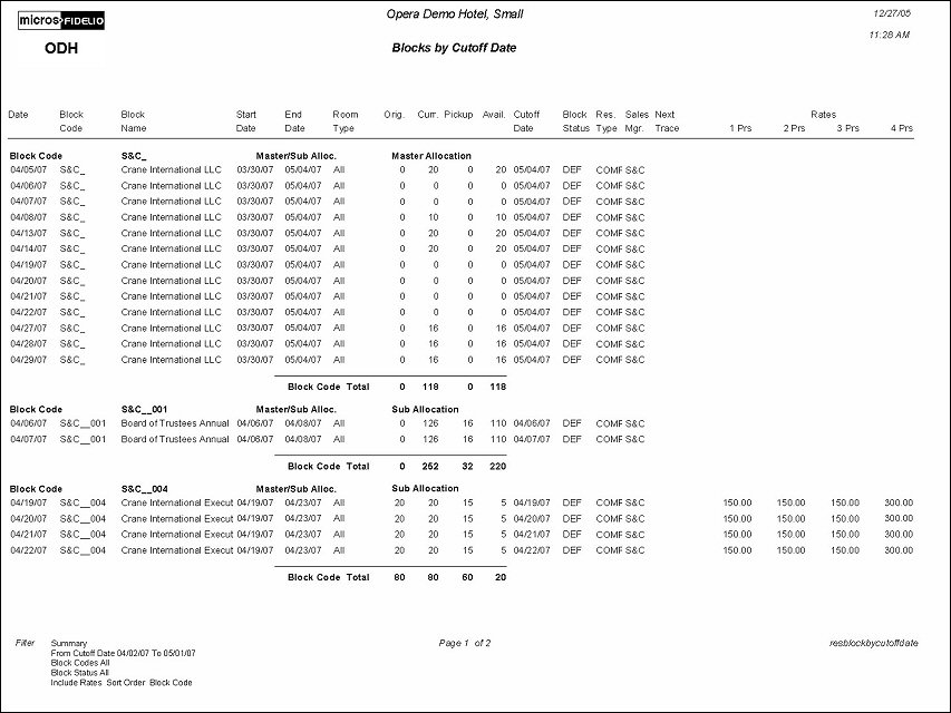 Note: When the application function Blocks>Master Sub Allocation is active, Master/Sub-Allocations are labeled as such for each Master/Sub that displays on this report. Additionally, for Master Allocations the Current Column should print AVAILABLE rooms not the number of blocked rooms, and the Pickup Columns will always display zero. Totals for Master/Sub-Allocations will be calculated accordingly.