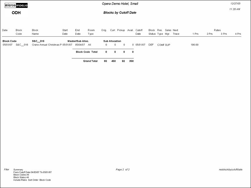 The Blocks By Cutoff Date Report can be used by Reservations or Sales staff to determine which dates specific blocks will be cut off. The ability exists to print summarized information or details of the Block Header. They can then contact the group coordinator and ask for a booking commitment or a release of the blocked rooms.