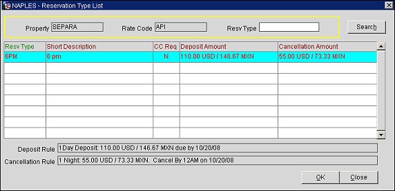 To search for a specific reservation type, enter the reservation type in the Resv. Type field and select the Search button.