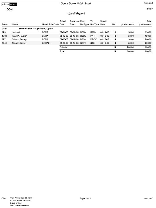 Available when the Reservations>Reservation Upsell application function is set to Y, this report displays any guests who paid additional monies to be upgraded to another room type. This information can be used to track the number of Upsells and Additional Room Revenue that Front Desk agents generated at check-in.