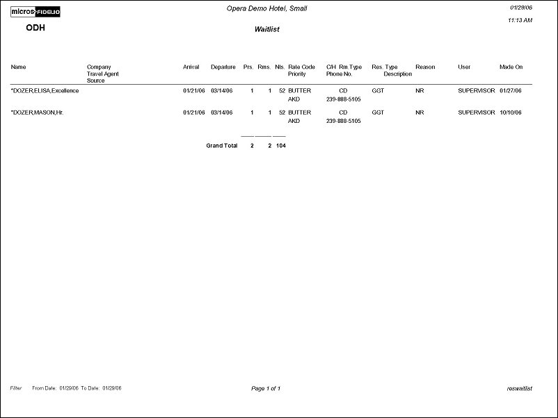 The Reservations Waitlist Report displays details about guests whose reservations cannot be made because of lack of availability. If there is a fall out in reservations, waitlist guests may be moved to the reservations file. When rooms become available, Front Office managers can print this report to review a list of waitlisted reservations to determine the number of potential reservations that are able to generate maximum revenue, and can be moved to the active reservations list.