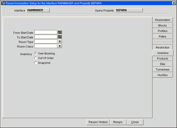 Inventory. You can select between an Overbooking, Out Of Order or Snapshot resync by checking one of the radio buttons. When you select the Out Of Order radio button, the field Room Class is removed from the screen.